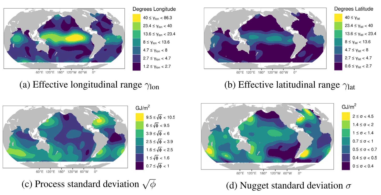 Description: The accurate quantification of changes in the heat content of the world’s oceans is crucial for our understanding of the effects of increasing greenhouse gas concentrations. The Argo program, consisting of Lagrangian floats that measure vertical temperature profiles throughout the global ocean, has provided a wealth of data from which to estimate ocean heat content. However, creating a globally consistent statistical model for ocean heat content remains challenging due to the need for a globally valid covariance model that can capture complex nonstationarity. In this paper, we develop a hierarchical Bayesian Gaussian process model that uses kernel convolutions with cylindrical distances to allow for spatial nonstationarity in all model parameters while using a Vecchia process to remain computationally feasible for large spatial datasets. Our approach can produce valid credible intervals for globally integrated quantities that would not be possible using previous approaches. These advantages are demonstrated through the application of the model to Argo data, yielding credible intervals for the spatially varying trend in ocean heat content that accounts for both the uncertainty induced from interpolation and from estimating the mean field and other parameters. Through cross-validation, we show that our model outperforms an out-of-the-box approach as well as other simpler models. The code for performing this analysis is provided as the R package BayesianOHC.